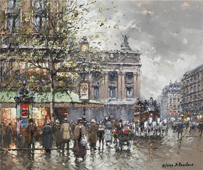 简介: 安托万·布兰查德·法兰西(Antoine Blanchard)-“歌剧院广场和Paix咖啡馆 1900年”