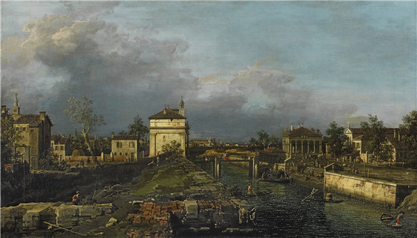 这件艺术品描绘了帕多瓦历史悠久的布伦塔运河的宁静景观。运河岸边排列着建筑物,展示了那个时期的典型建筑元素。场景包括各种大小的建筑,从宏伟的建筑到朴素的住宅,通过桥梁和小路相互连接。可以看到船只在运河宁静的水面上滑行,镇民们正在进行日常活动,为构图增添了生动的人性元素。天空以柔和的色调呈现,暗示着平静祥和的一天。每个建筑细节和自然元素都经过精心绘制,反映了卡纳莱托捕捉 18 世纪意大利精髓的专业工艺。