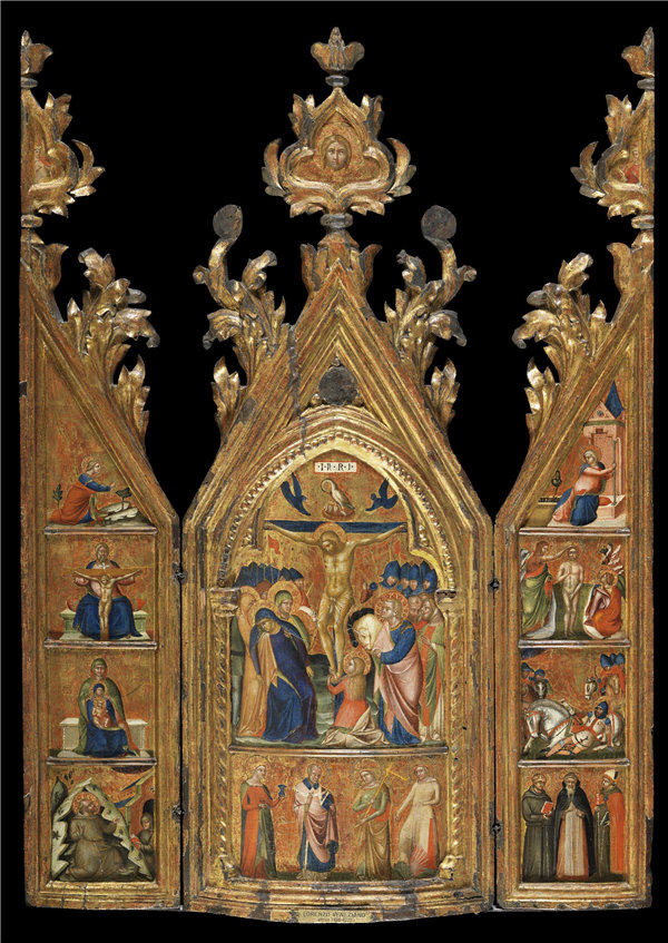简介: 洛伦佐·韦内齐亚诺(Lorenzo Veneziano)-带有中央受难点的便携式三联画 1370年-1375年蛋彩画作品。洛伦佐·韦内齐亚诺(Lorenzo Veneziano ),意大利画家,生于1356年,卒于1372年。很短暂的一生,才刚刚开始,就很快的结束了。但是,这掩盖不了他对艺术领域的贡献。洛伦佐·韦内齐亚诺所创作的大都是宗教题材的作品。还有很多的教堂的祭祀装饰画。这点在他的作品中能够很明显的看出来。洛伦佐·韦内齐亚诺出生在一个普通的家庭,从小就表现出了对艺术的超于常人的天赋和兴趣,在父母的支持下,很快变开始了自己的创作生涯。他的作品大部分是为教堂祭祀创作的装饰画。有着很强烈的宗教色彩。画中大都描绘的是虔诚的信徒的形象,或者圣母,或圣婴,或是一些朝拜的场景,也或是受洗的情形。这些作品部分收藏在博物馆之内,也可以在教堂内领略到这些艺术品的风采。