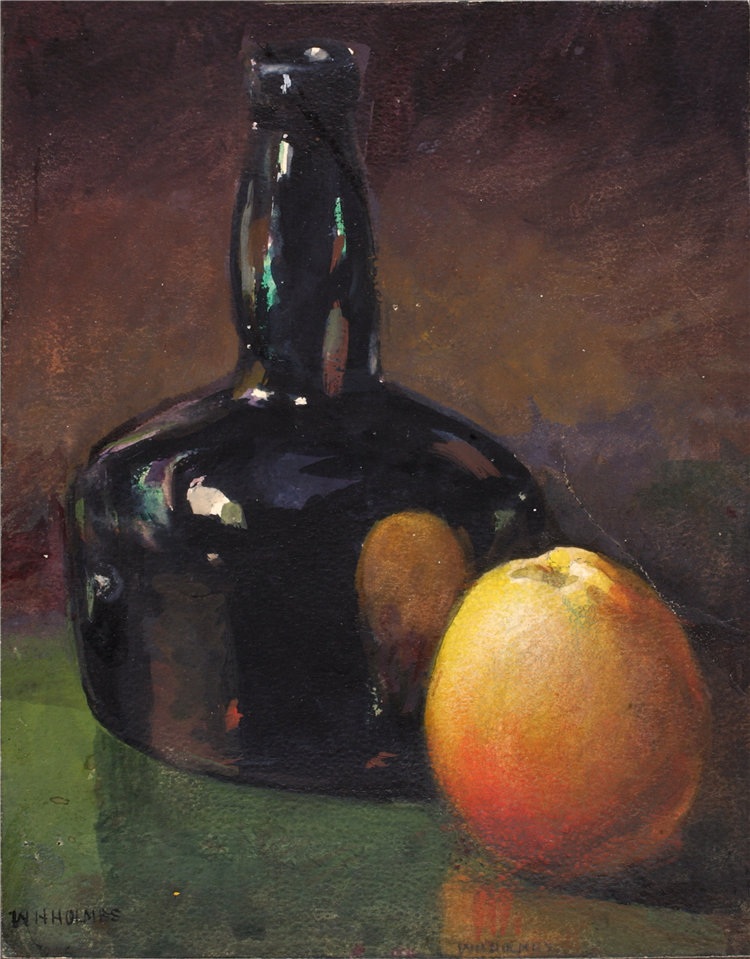 简介: 威廉·亨利·福尔摩斯(William Henry Holmes)-《静物——苹果和瓶子》水彩画 美国