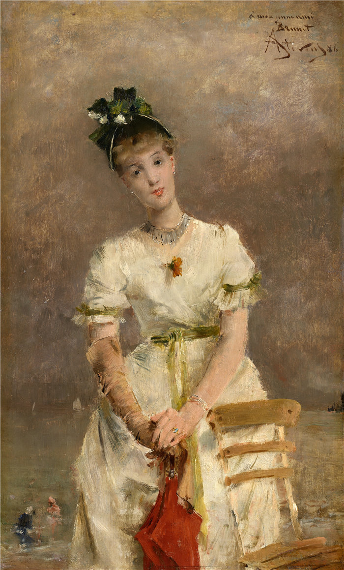 简介: 阿尔弗雷德·史蒂文斯(Alfred Stevens,比利时画家)作品-海边的年轻女子 (1886)