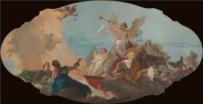简介: 乔瓦尼·巴蒂斯塔·提埃波罗(Giovanni Battista Tiepolo,意大利画家)作品-巴巴罗家族的荣耀(约 1750 年)