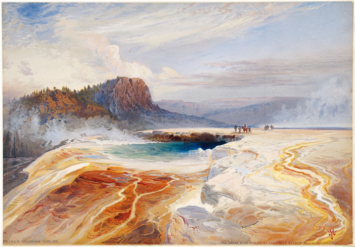 简介: 托马斯·莫兰 (Thomas Moran,美国画家)作品-黄石下间歇泉盆地的大蓝泉(约 1875 年)