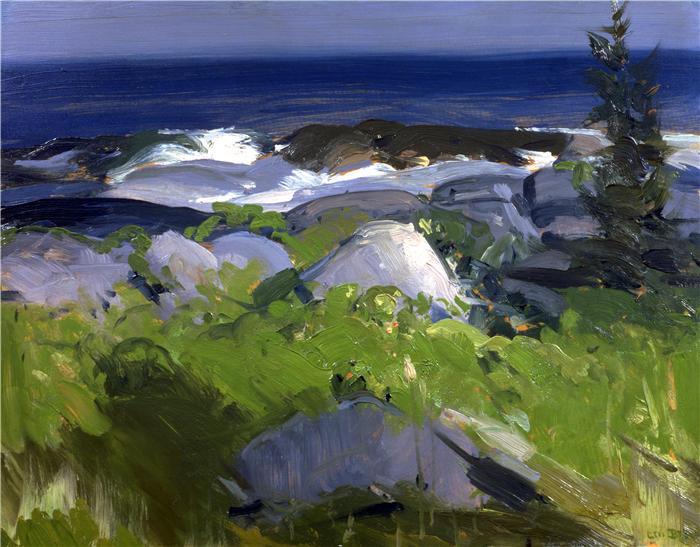 简介: 乔治·韦斯利·贝洛斯(George Wesley Bellows,美国画家)作品-《藤蔓覆盖的海岸-蒙赫根岛(1913年)》高清下载