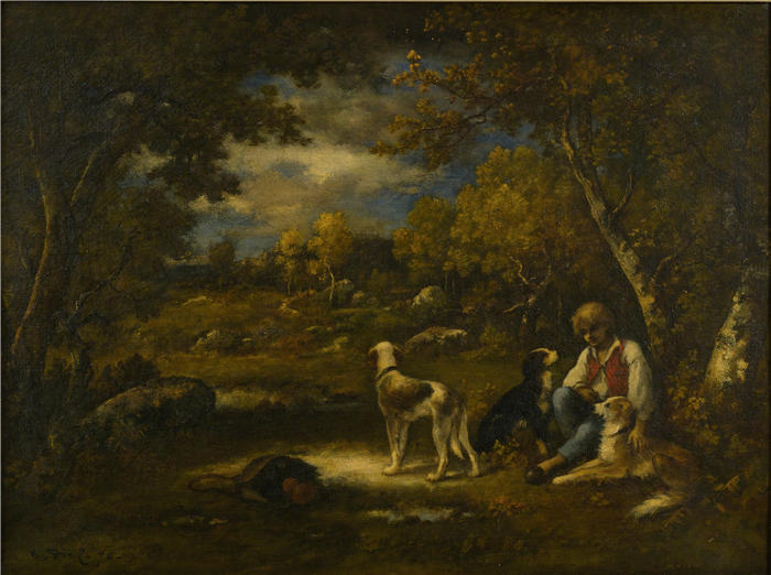 简介: 纳西斯·迪亚兹·德·拉·佩纳(Narcisse-Virgile Diaz de la Peña,法国画家)作品-《男孩和他的狗在树林里 (76)》