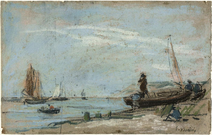 简介: 欧仁·布丁(Eugène Boudin,法国画家)高清作品-《带渔船的海滩(1870-79 年)》