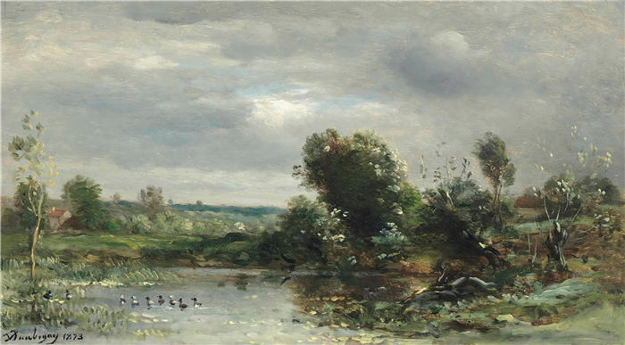 简介: 查尔斯·弗朗索瓦·杜比尼(Charles-Francois Daubigny,法国画家)高清作品-《湖上的小鸭子 (1873)》