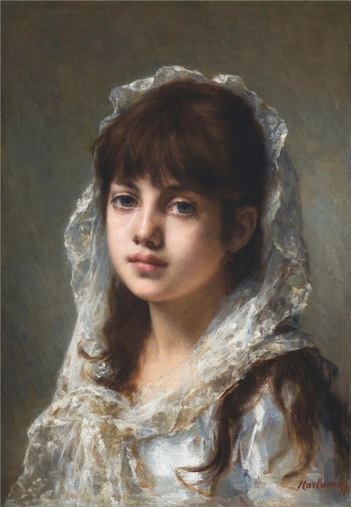 简介: 阿列克谢·哈拉莫夫(Alexei Harlamoff,俄罗斯画家)-《一个戴着白色面纱的年轻女孩的肖像》