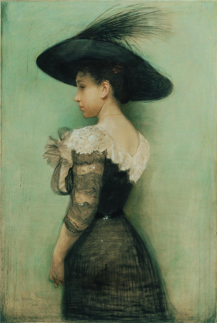 简介: 约翰·昆西亚·当斯(John Quincy Adams ,奥地利画家)作品-穿黑衣服戴黑帽子的女士(爱丽丝·豪瑟)(1901)