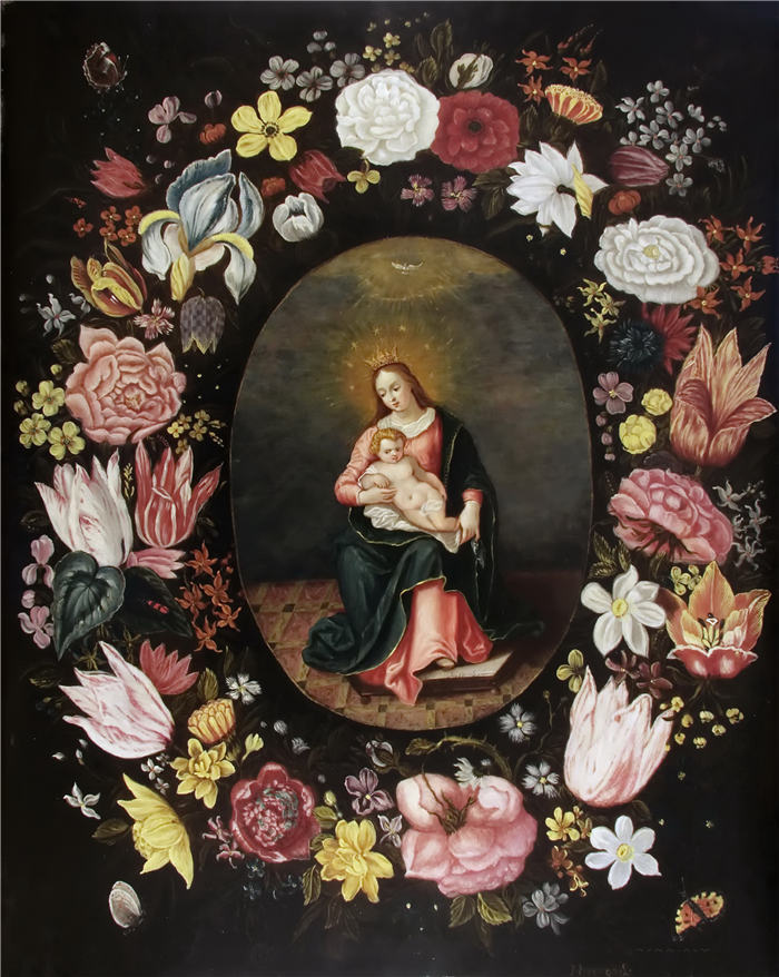 简介: (061)小彼得·勃鲁盖尔(Pieter Brueghel the Younger)超清清作品-《圣母子和花环》