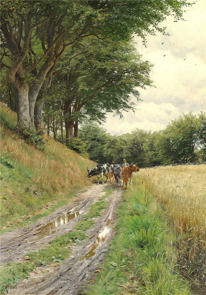简介: 佩德·莫克·蒙森德(Peder Mork Monsted)高清作品-农民在森林边缘的小路上赶牛-1904