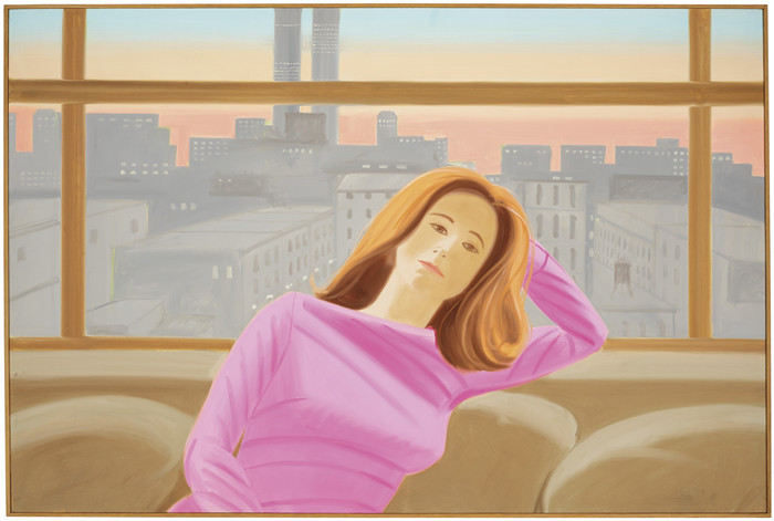 这件艺术品描绘了一个女人若有所思地斜靠在似乎是沙发的东西上。她穿着一件鲜艳的粉红色衣服,红发垂在肩上,眼睛沉思地凝视着。背景是沐浴在日落柔和色调中的城市景观,建筑物以极简主义、近乎印象派的风格呈现。这种城市景观,加上它所框住的大窗户,暗示着一个亲密而广阔的空间。卡茨的作品以其简单和优雅为特点,将日常与凄美的内省感相结合。
