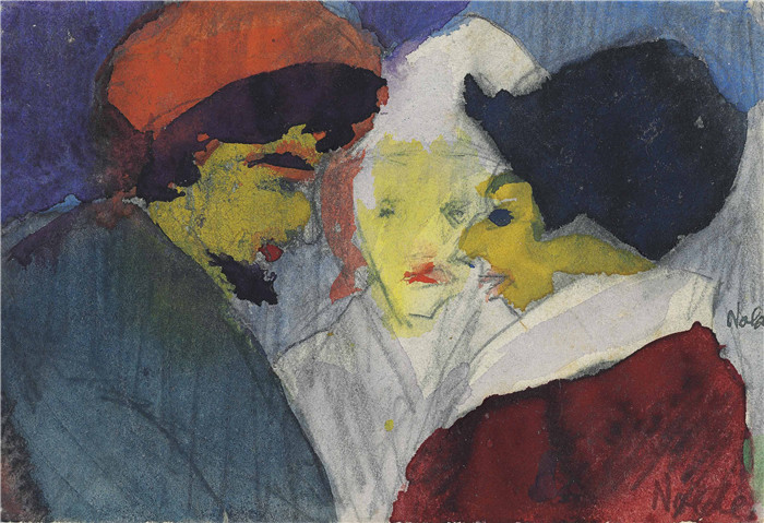 简介: 埃米尔·诺尔德(Emil Nolde)作品-《对话中的两个女人和一个男人》,1940年