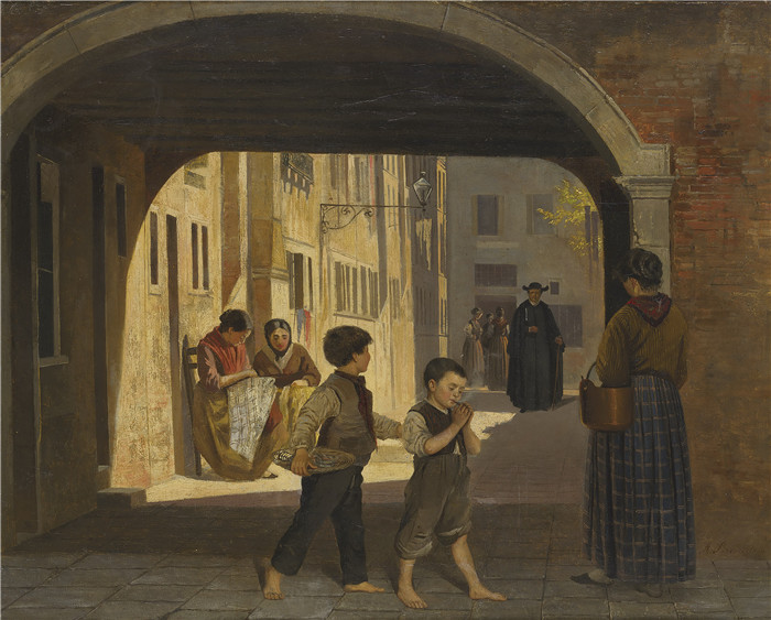 简介: 安东尼奥·布兰代斯(Antonietta Brandeis)油画-拱门下有孩子的街景
