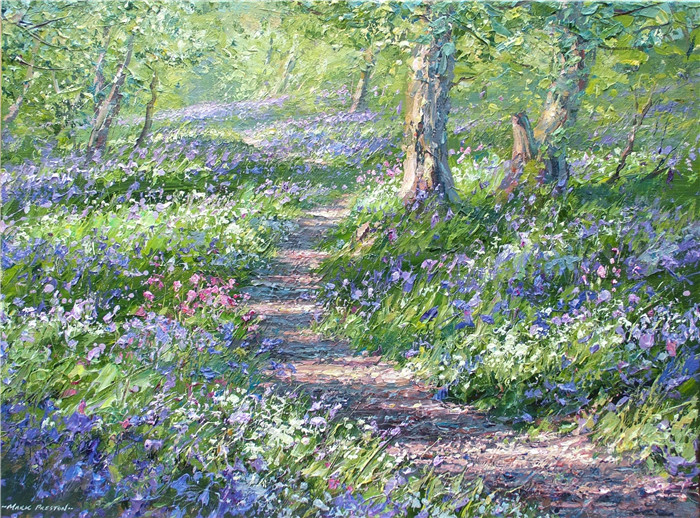简介: 马克·普雷斯顿(Mark Preston)高清油画-蓝铃草 Bluebells and Stitchwort Bramley Wood 18x24