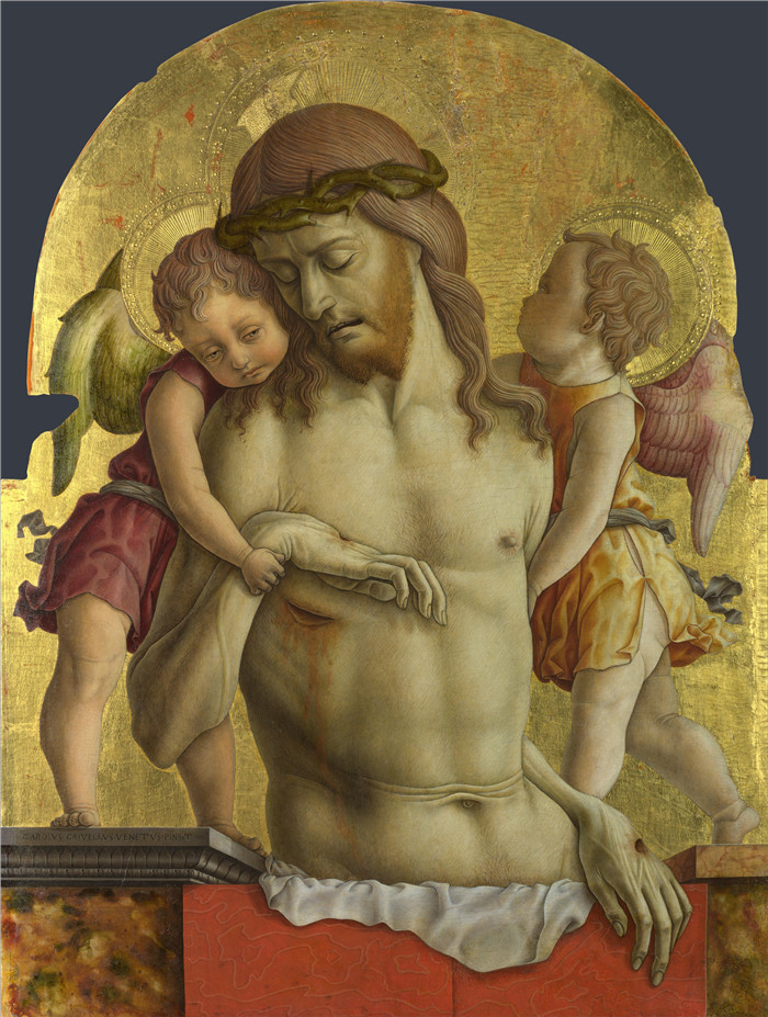 简介: 卡洛·克里维利(Carlo Crivelli)作品-两位天使支持的死基督The Dead Christ supported by Two Angels