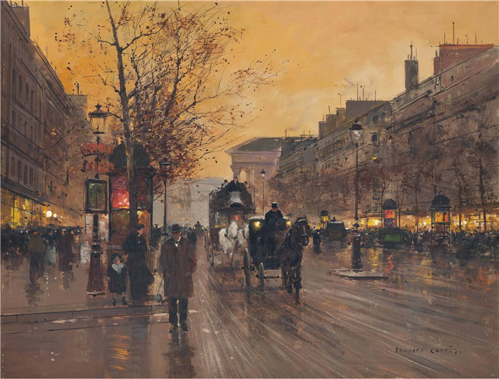简介: 科尔特斯 (edouard leon cortes)作品-La Madeleine大道上的日落Закат на бульваре ла Мадлен (55 x 70 см) (масло, холст) (Частная коллекция)