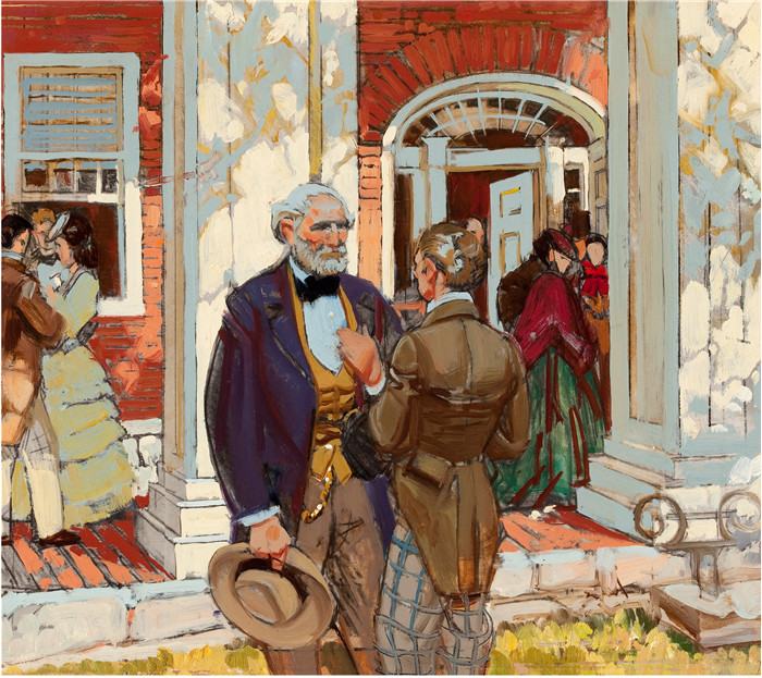 简介: 迪恩·康威尔(Dean Cornwell)作品-对话The Conversation. Mixed media on board. 11 x 12.5 in