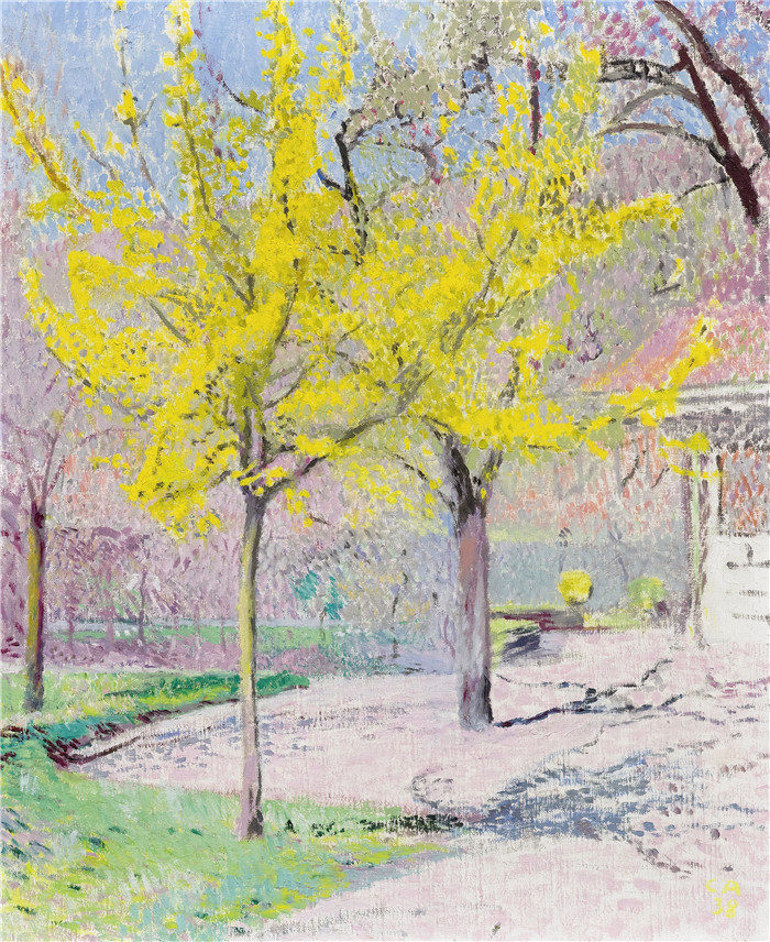 简介: 库诺·阿米埃特(Cuno Amiet)高清作品-春天树木环绕的阿米特·库诺景观amiet cuno landscape in spring with trees