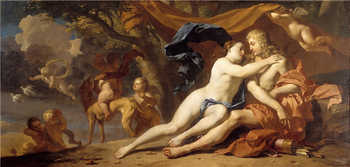 简介: 卡雷尔·杜雅尔丹(Karel Dujardin) 的画作-金星试图阻止阿多尼斯狩猎 Venus tracht Adonis te weerhouden van de jacht - NK2386 - Cultural Heritage Agency of the Netherlands Art Collection