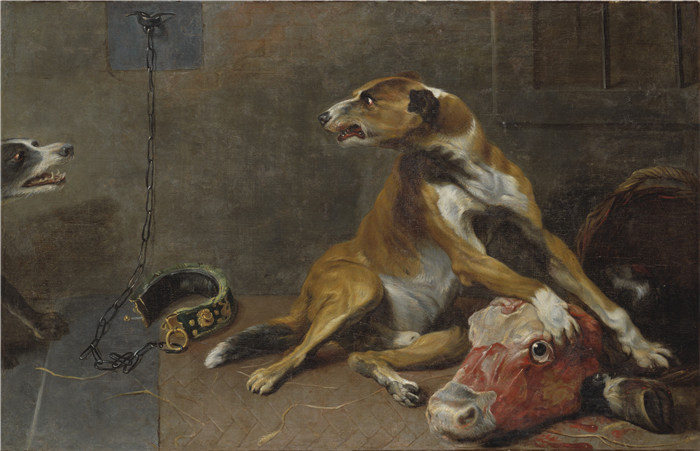 简介: 弗兰斯·斯奈德斯(Frans Snyders)油画-狗争食剥皮牛头Dogs Fighting over a Flayed Ox's Head