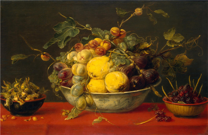 简介: 弗兰斯·斯奈德斯(Frans Snyders)油画-碗中水果,红布衬底Fruit in a Bowl on a Red Cloth