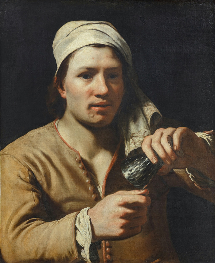 简介: 迈克尔·斯威特斯(Michael Sweerts)画作-戴头巾的年轻人Young man wearing a turban holding an upturned roemer
