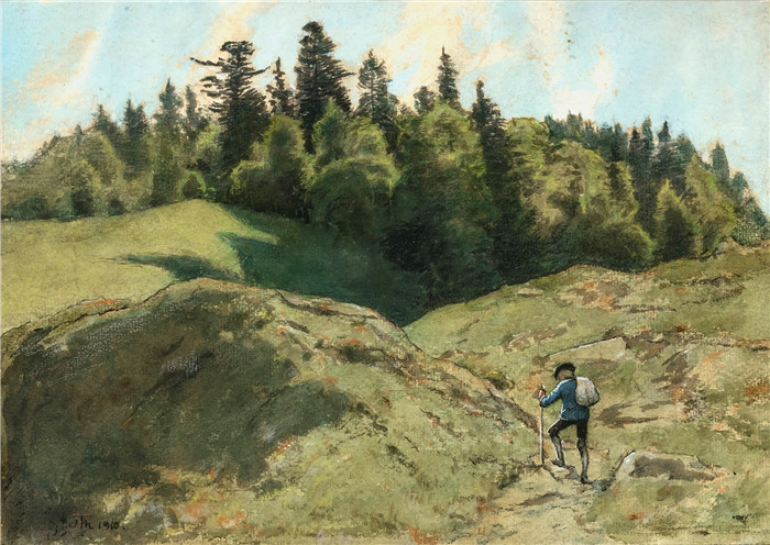 简介: 汉斯·托马(Hans Thoma)作品-山地漫步者Wanderer in hügeliger Landschaft (1910)