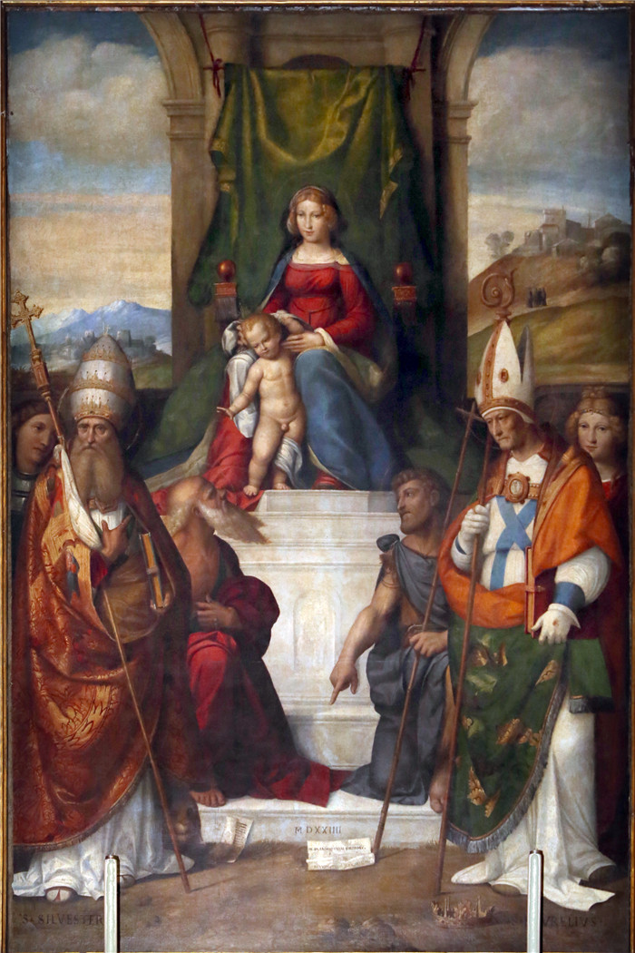 简介: 本韦努托·提西(Benvenuto Tisi)作品-圣母端坐于宝座上madonna in trono tra i ss. maurelio, silvestro, girolamo e il battista, 1524, 01
