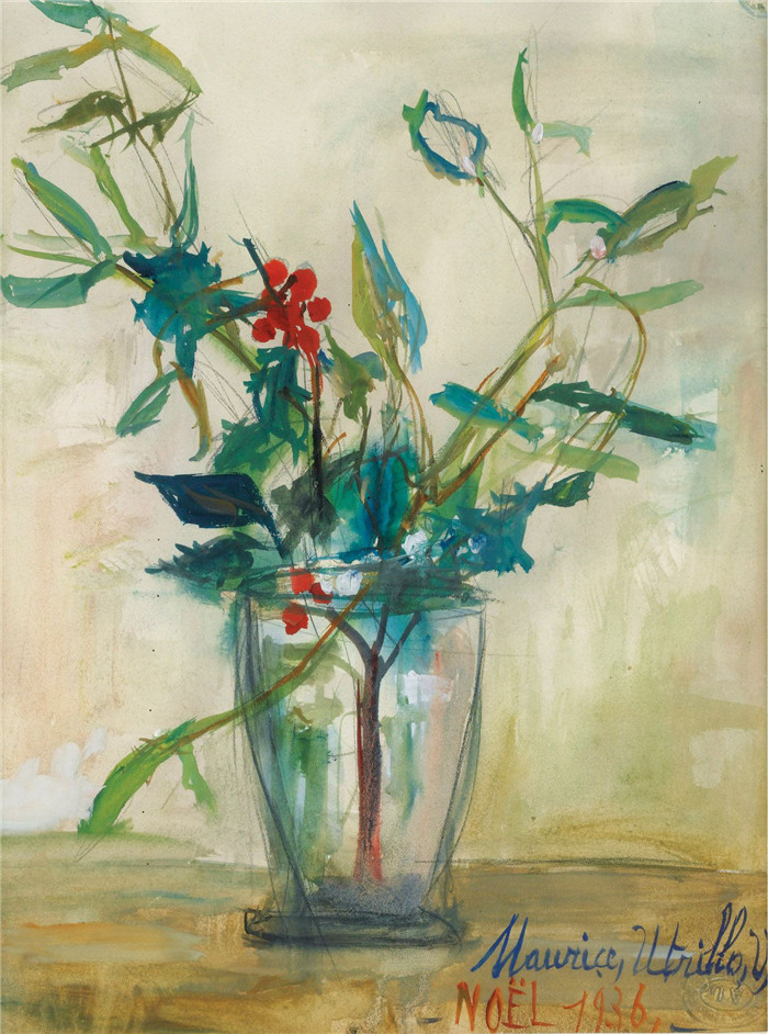 简介: 莫里斯·乌特里略(Maurice Utrillo)的绘画-花瓶里的冬青树枝Branch of Holly Tree in a Vase, 1936