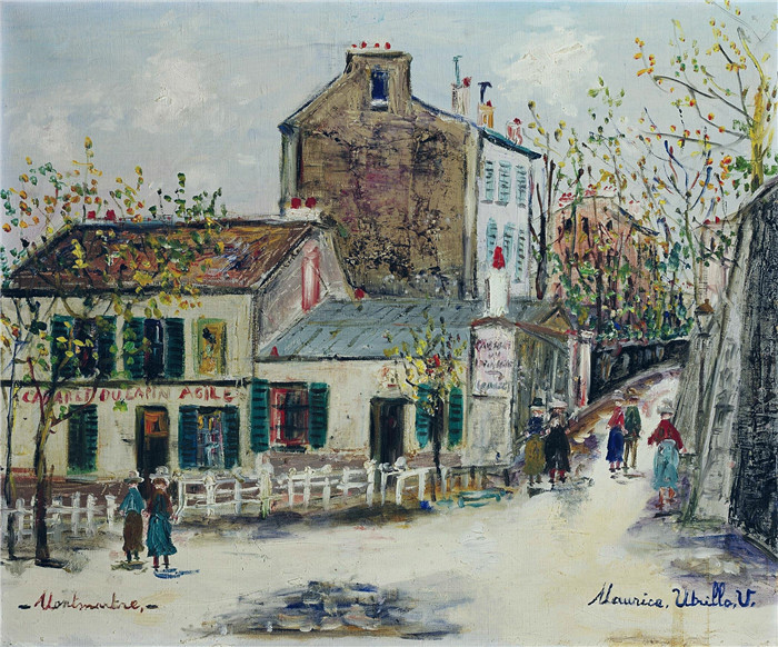 简介: 莫里斯·乌特里略(Maurice Utrillo)的绘画-拉平·阿敏捷在蒙马特的歌舞表演The Cabaret of Lapin Agile at Montmartre, 1944