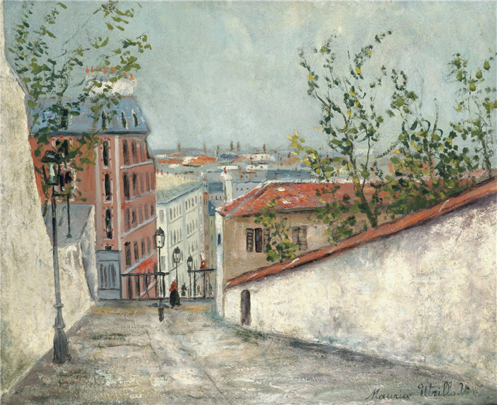 简介: 莫里斯·乌特里略(Maurice Utrillo)的绘画-蒙马特的森尼斯山街Mont-Cenis Street at Montmartre