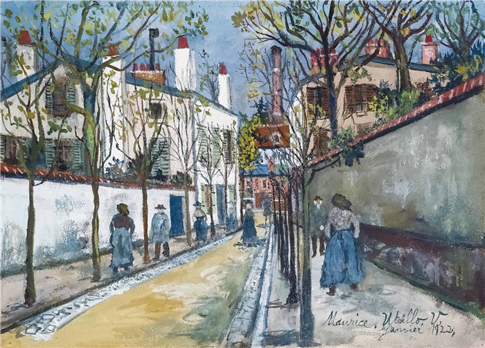 简介: 莫里斯·乌特里略(Maurice Utrillo)的绘画-蒙马特街Street at Montmartre, 1922