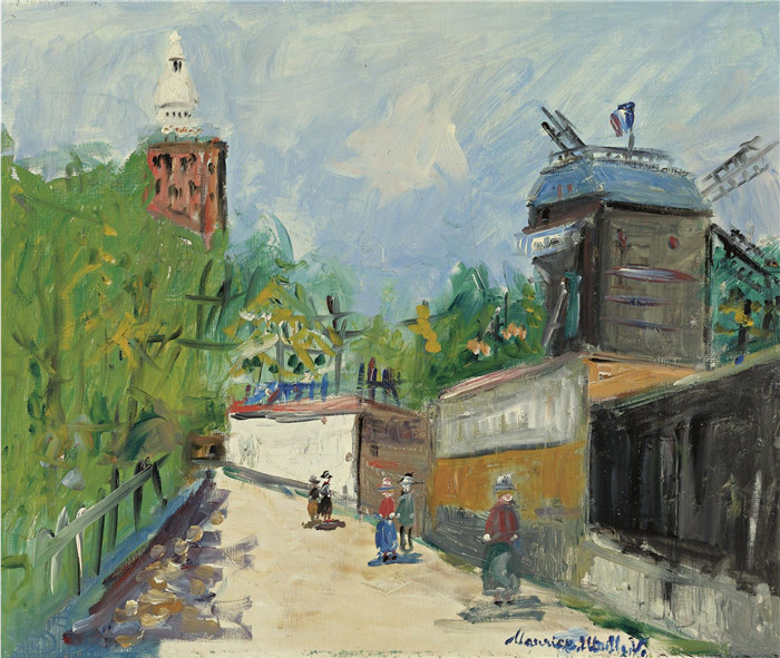 简介: 莫里斯·乌特里略(Maurice Utrillo)的绘画-蒙马特磨坊Le Moulin de la Galette, Montmartre, 1951