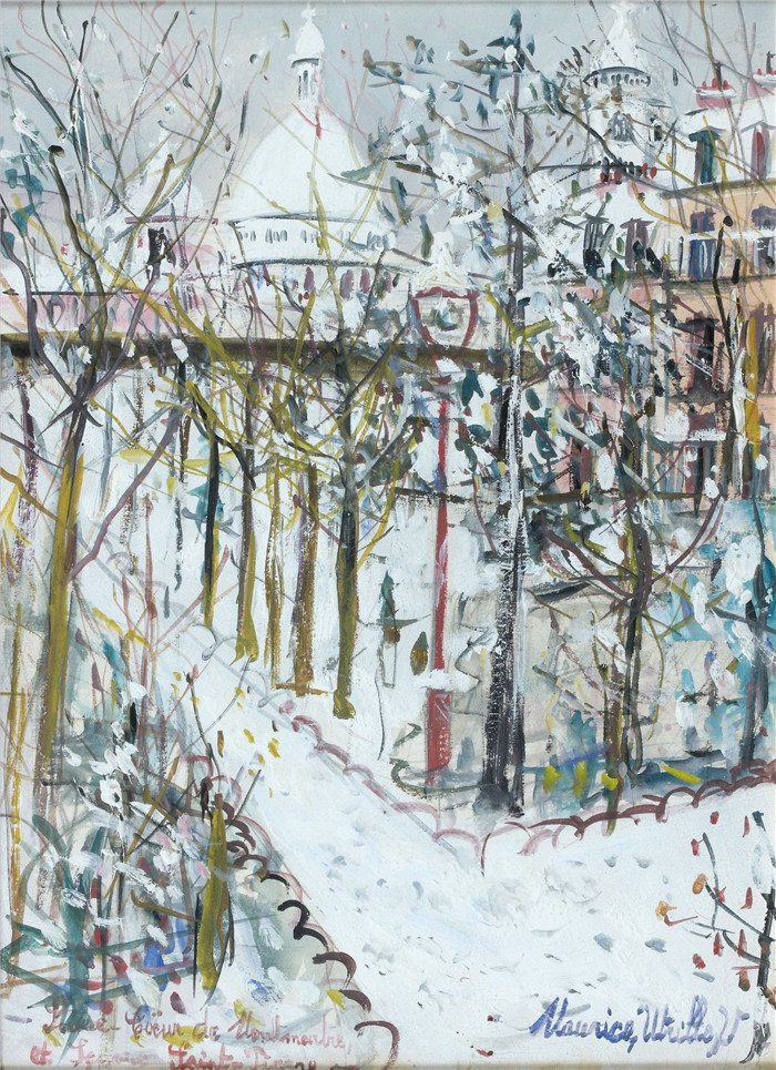 简介: 莫里斯·乌特里略(Maurice Utrillo)的绘画-蒙马特圣心教堂和圣皮埃尔广场Sacre-Coeur de Montmartre and Saint-Pierre Square, 1934