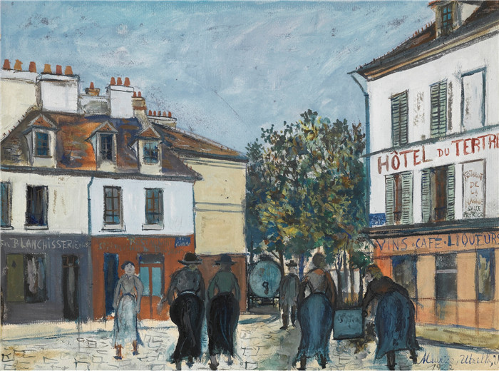 简介: 莫里斯·乌特里略(Maurice Utrillo)的绘画-蒙马特特雷广场Tertre Square at Montmartre, 1922