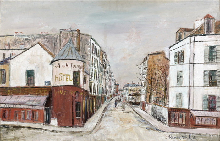 简介: 莫里斯·乌特里略(Maurice Utrillo)的绘画-图雷尔咖啡馆,蒙马特塞纳斯山街Cafe Tourelle, Mont-Cenis Street, Montmartre, 1935