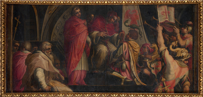 简介: 乔治·瓦萨里(Giorgio Vasari)的画作-克莱门特四世将他的徽章交给圭尔夫部分的船长Clemente IV hands his insigna to the captains of the Guelph Part