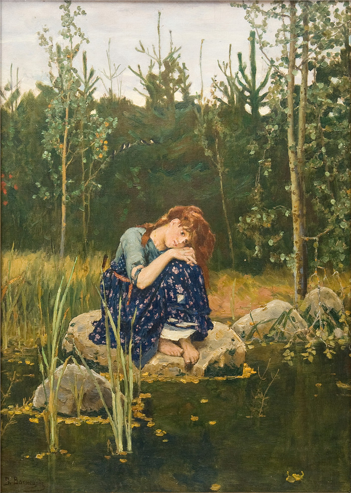作品描绘了一个孤独的身影,名叫阿廖努什卡,沉思地坐在一块静止、反光的池塘旁的岩石上。场景设定在丰富的自然环境中,高草和细长的树木环绕着她,唤起一种忧郁与沉思的氛围。黑暗茂密的森林成为背景,增强了隐居的氛围。女孩的姿态和宁静而忧郁的色彩为画作增添了整体情感深度。瓦斯涅佐夫不仅捕捉了外貌相似,还捕捉了主题的叙事本质,展现了源自俄罗斯民间传说的感人时刻。