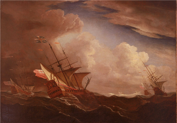 简介: 威廉·范德费尔德二世(Willem van de Velde II)画作-海上的英国船只在暴风中迎风航行English Ships at Sea Beating to Windward in a Gale