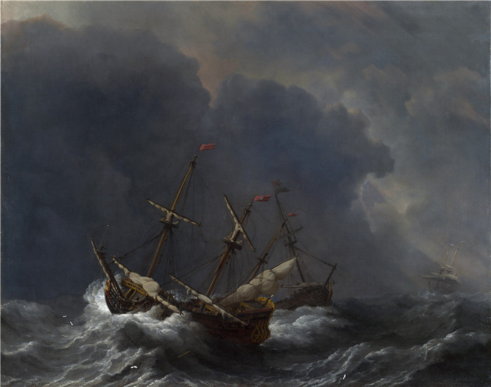 简介: 威廉·范德费尔德二世(Willem van de Velde II)画作-狂风中的三艘船Three Ships in a Gale