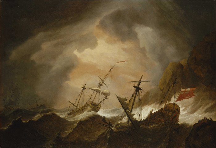 简介: 威廉·范德费尔德二世(Willem van de Velde II)画作-两艘英国船只在岩石海岸遭遇风暴触礁沉没Two English Ships Wrecked in a Storm on a Rocky Coast