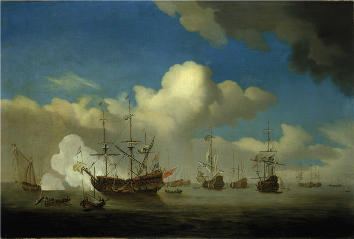 简介: 威廉·范德费尔德二世(Willem van de Velde II)画作-四日海战后荷兰船只满载战利品返回戈雷岛Dutch ships returning with their prizes to Goeree after the Four Days Battle, 4 June 1666