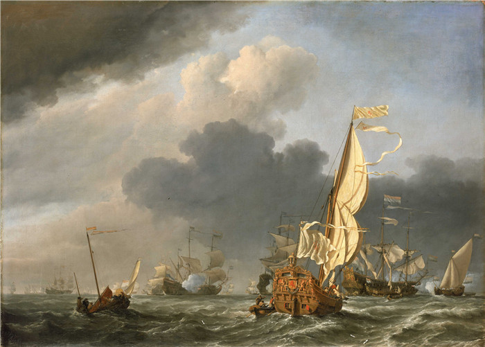 简介: 威廉·范德费尔德二世(Willem van de Velde II)画作-一艘美国游艇在清新的微风中驶向一群荷兰船只A States Yacht in a Fresh Breeze Running Towards a Group of Dutch Ships