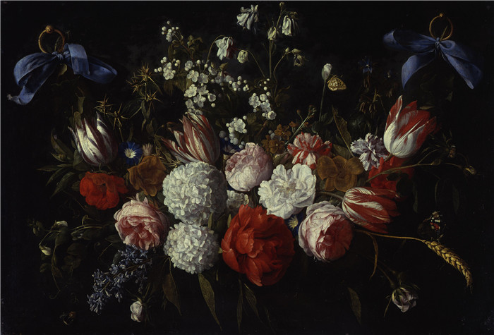 简介: 尼古拉斯·范·韦伦达尔(Nicolaes van Verendael)的绘画-蓝色缎带上的花环Blumengewinde an blauen Schleifen