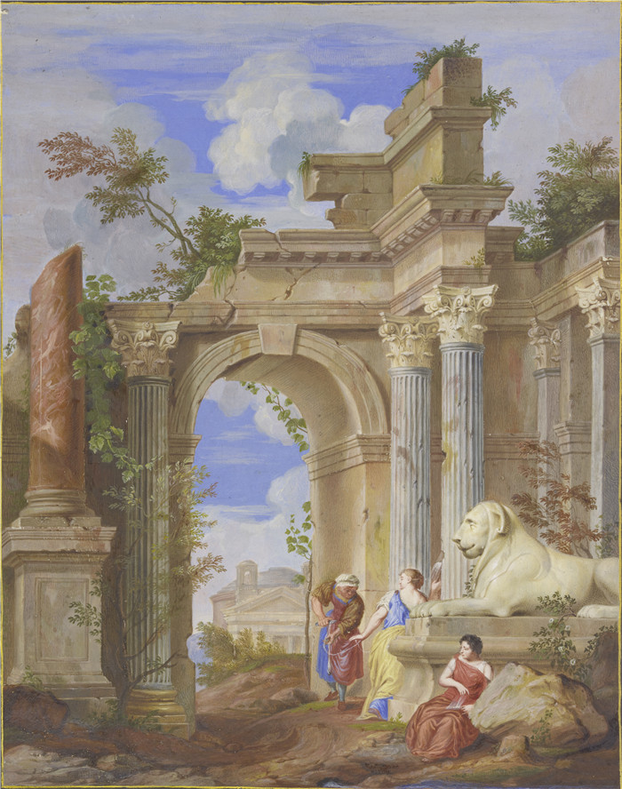 简介: 扬·巴普蒂斯特·维尼克斯(Jan Baptist Weenix)作品-在罗马建筑废墟中,三女神矗立In den Ruinen römischer Architektur die drei Parzen, rechts ein Löwe aus Marmor