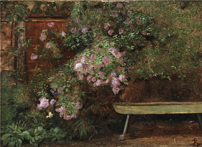 简介: 克里斯蒂安·扎尔特曼(Kristian Zahrtmann)高清作品-长椅后盛开的毒芹丛 Blomstrende syrenbusk bag en bænk - 1869