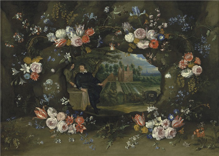 简介: 扬·托马斯(Jan Thomas van Ieperen)画作-尼古拉斯·德曼肖像Portrait of Nicolaas de Man in the grounds of his country estate in the neighbourhood of Antwerp, surrounded by a garland of flowers