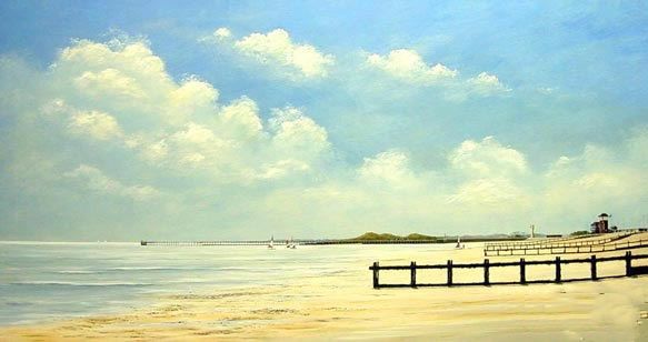 This demonstration shows the development of a very large painting (1.5m x .75m) using acrylics on canvas. The commission required an afternoon scene of Littlehampton Beach, looking West along the beach towards the harbour entrance. The substantial canvas was made for me by Angmering Framing and the first job was to prime it with four coats of gesso primer. The general composition was discussed with the client, who fortunately gave me plenty of scope for the final detail. The original idea of a sunset was dropped because the resulting silhouettes in the foreground would lack colour and because the sun sets well inland – not conveniently over the sea!
