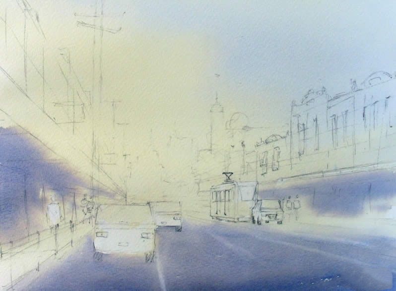 Notice in the drawing below that I made adjustments I felt added to the overall design of the image e.g. I put in the tram and car on the other side of the road and made the road a little narrower. I removed some of the trees on the right hand side and simplified the buildings there. When I do a painting like this I do not stick completely to what is in the photograph or the scene in front of me when painting from life. If I want an image with everything in it as is then I might as well just frame my photograph. Instead I make adjustments which I feel will give the message I want to convey with a minimum of brush strokes and drawing. In this case I wanted to show the sunset with people no doubt on their way home after a days work!